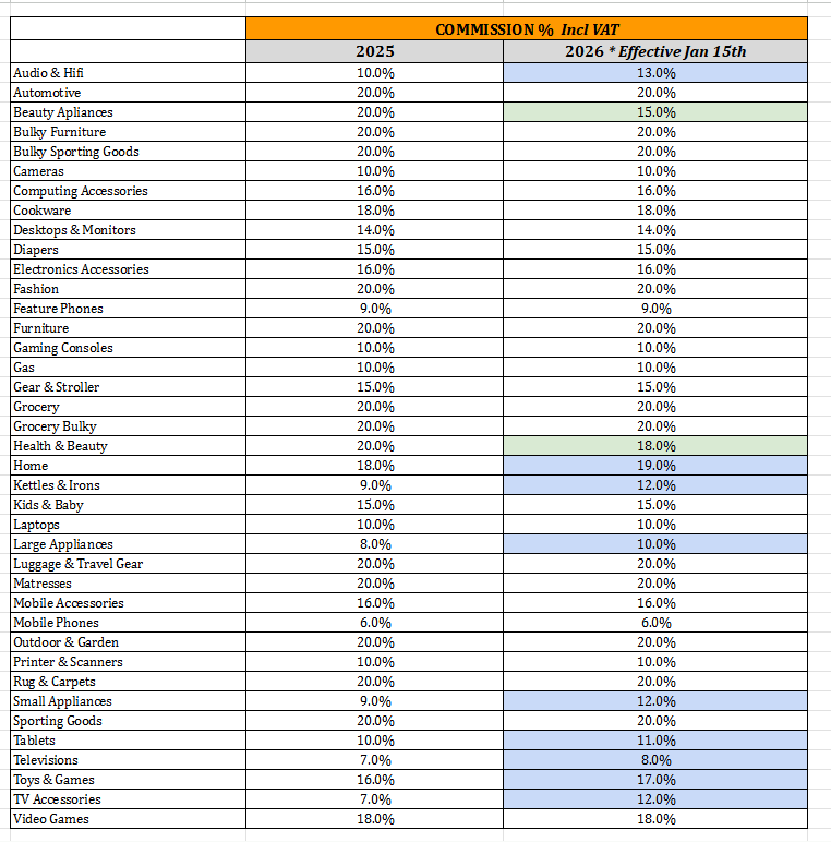Commissions are charged based on the category of products you wish to sell. Kindly Click Here to refer to the commission file based on the full specific category path of your product: Below is a short view.