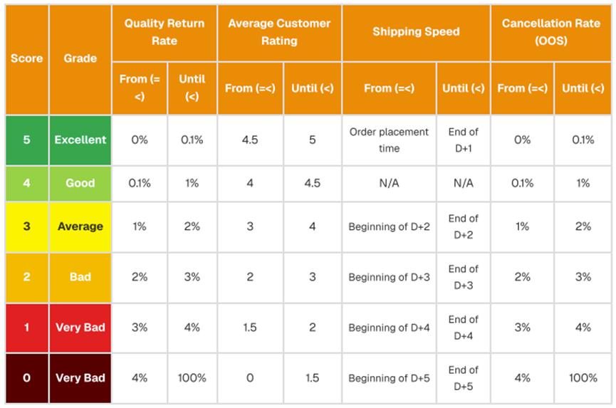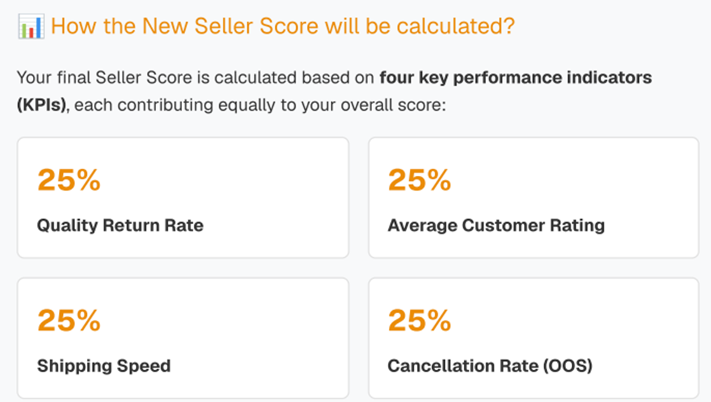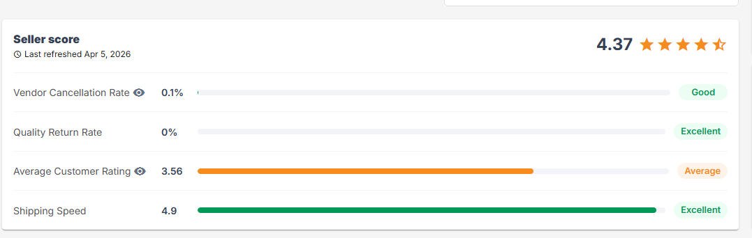 - Shipping Speeds: refers to the time it takes for vendors to prepare and drop off orders after receiving them. The faster a vendor prepares and ships orders, the higher their shipping speed KPI will be, which positively impacts their overall Seller Score.